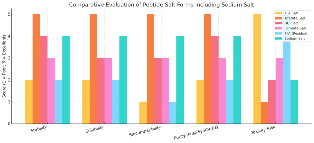 Choosing the correct salt form is critical in peptide research and formulation. Acetate and sodium salts are superior for stability, compatibility, and purity. In contrast, TFA salts, while synthetically convenient, are not recommended for use in sensitive biological systems due to toxicity concerns. Proper salt selection enhances solubility, reduces side effects, and ensures consistent experimental outcomes.